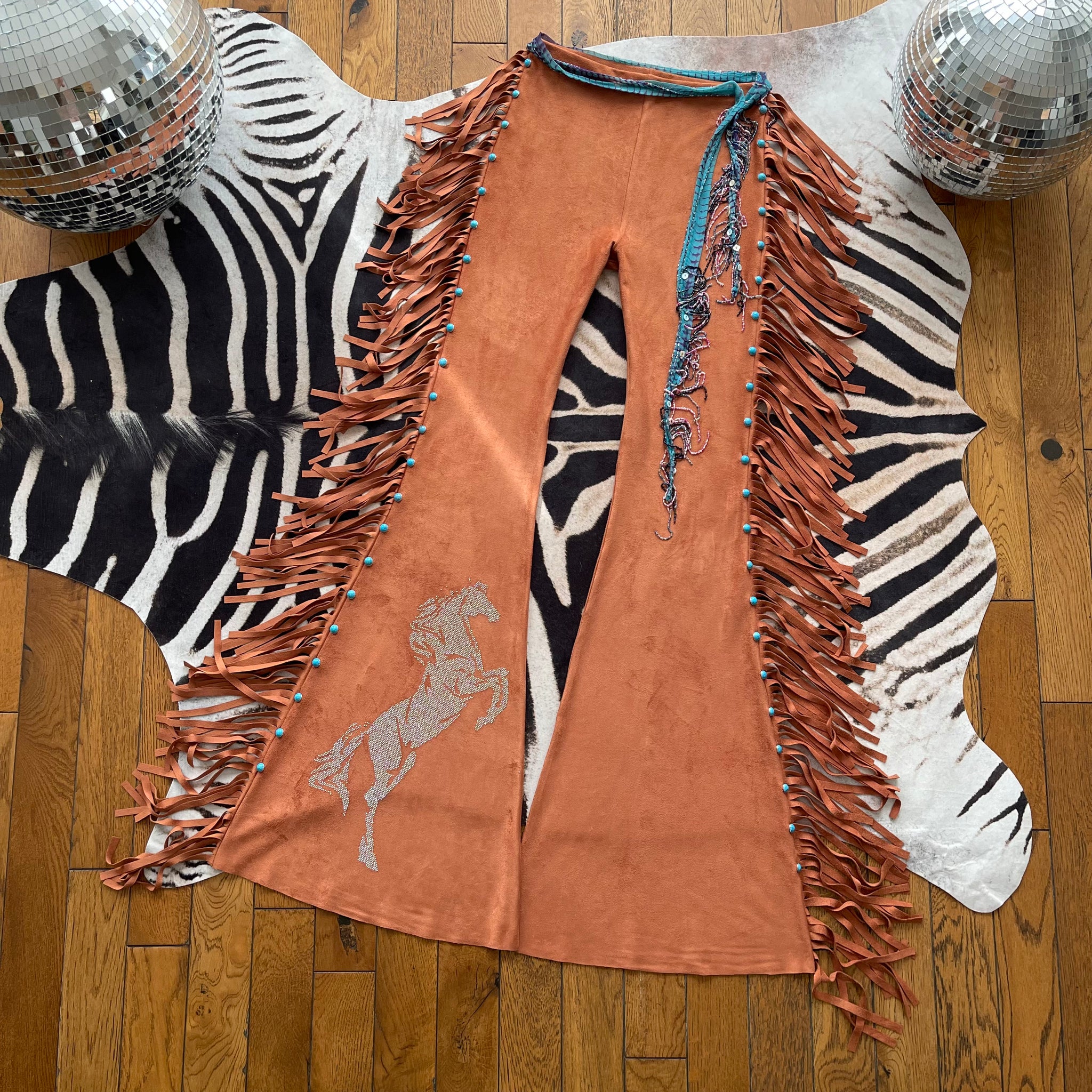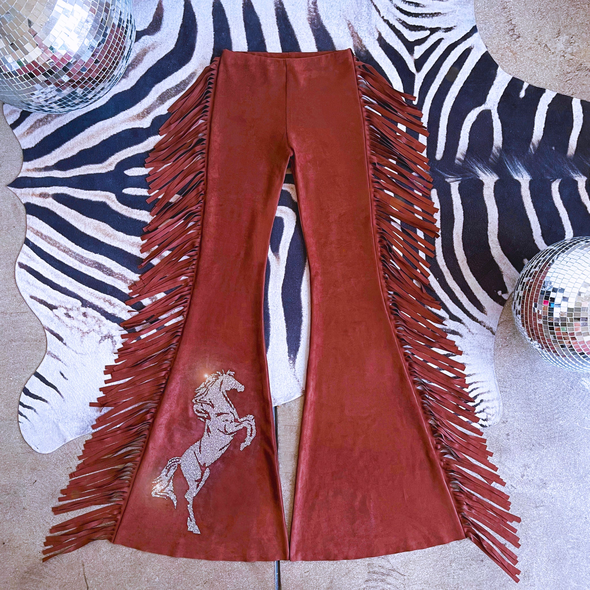 We've taken our vegan suede to the next level by adding fringe in same fabric all the way down side seams and a magical horse in clear crystals for a badass rhinestone cowgirl vibe!