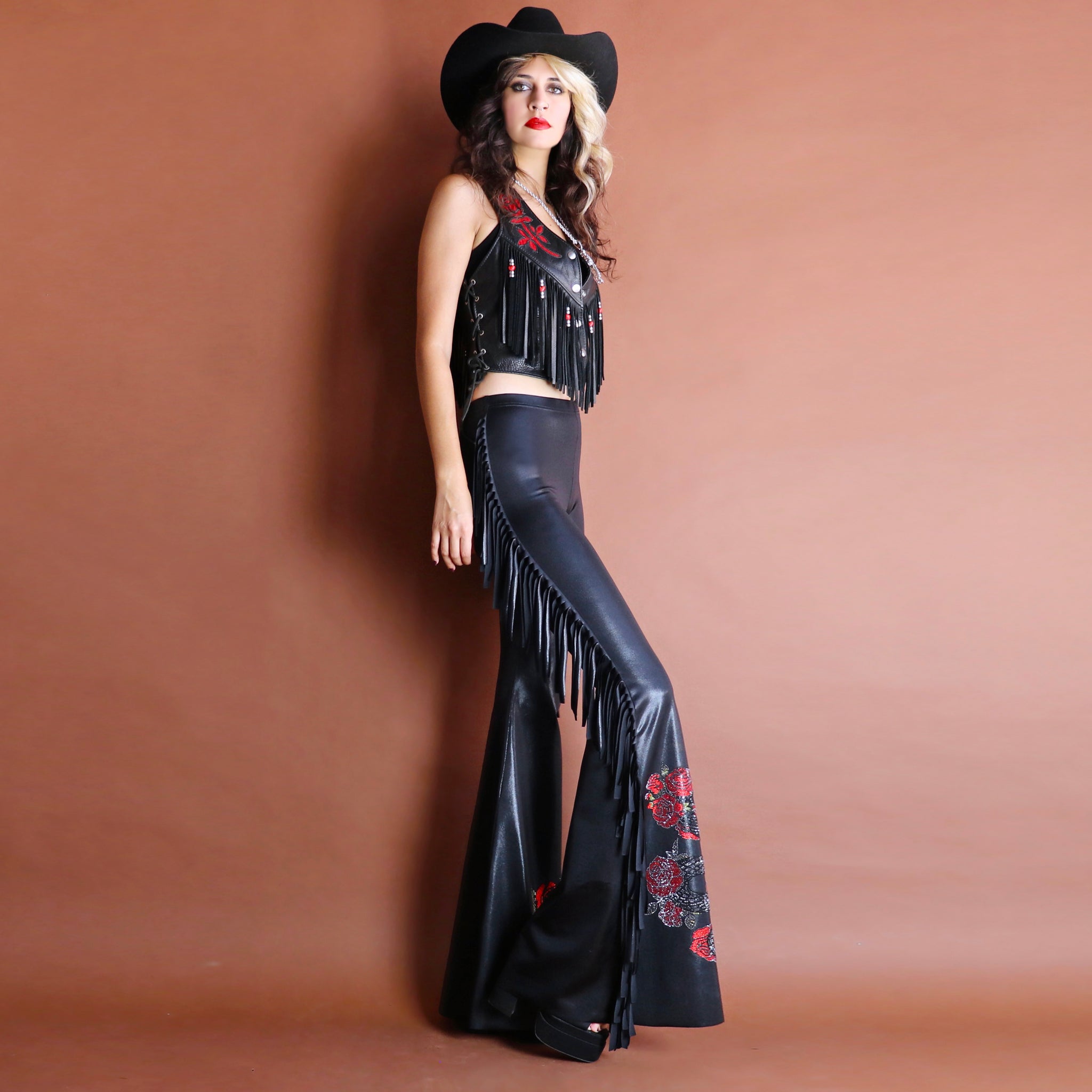 • Cascading black fringe down both side seams