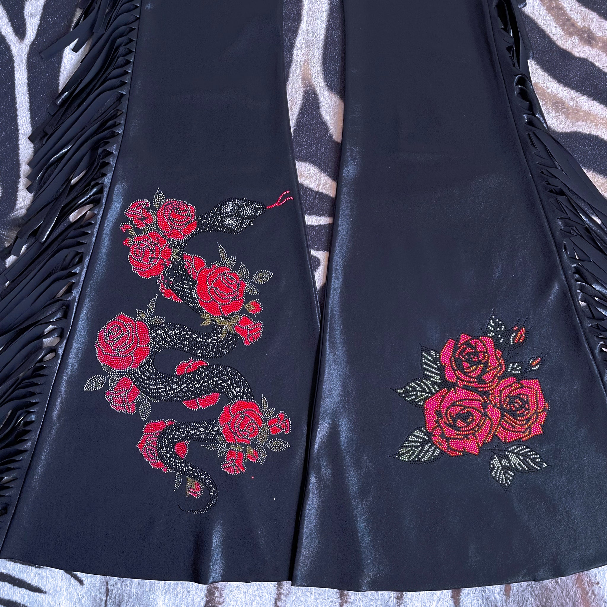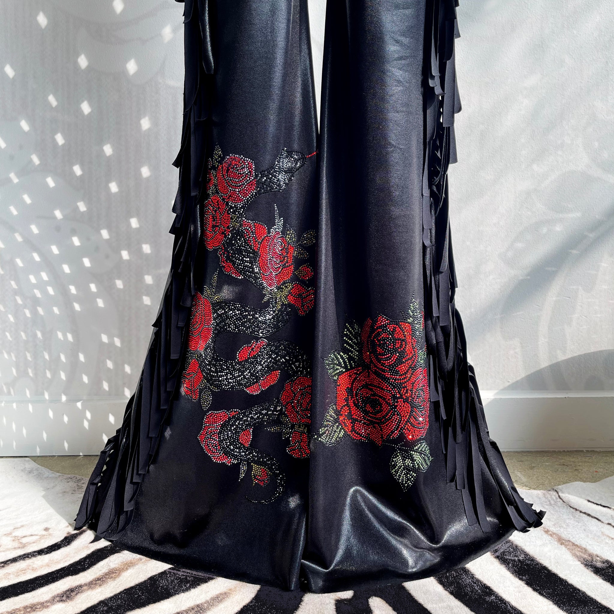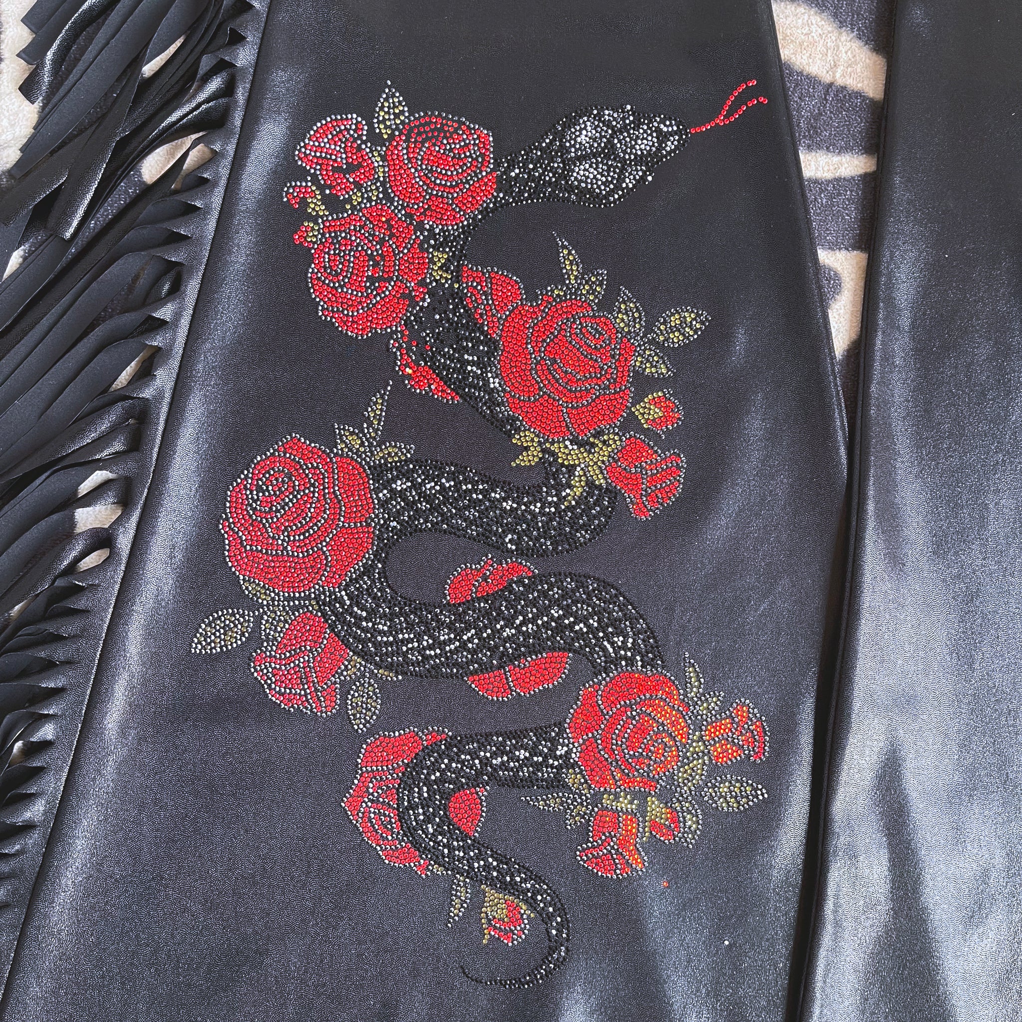 • Hand-placed crystal rose + serpent embellishment at one leg