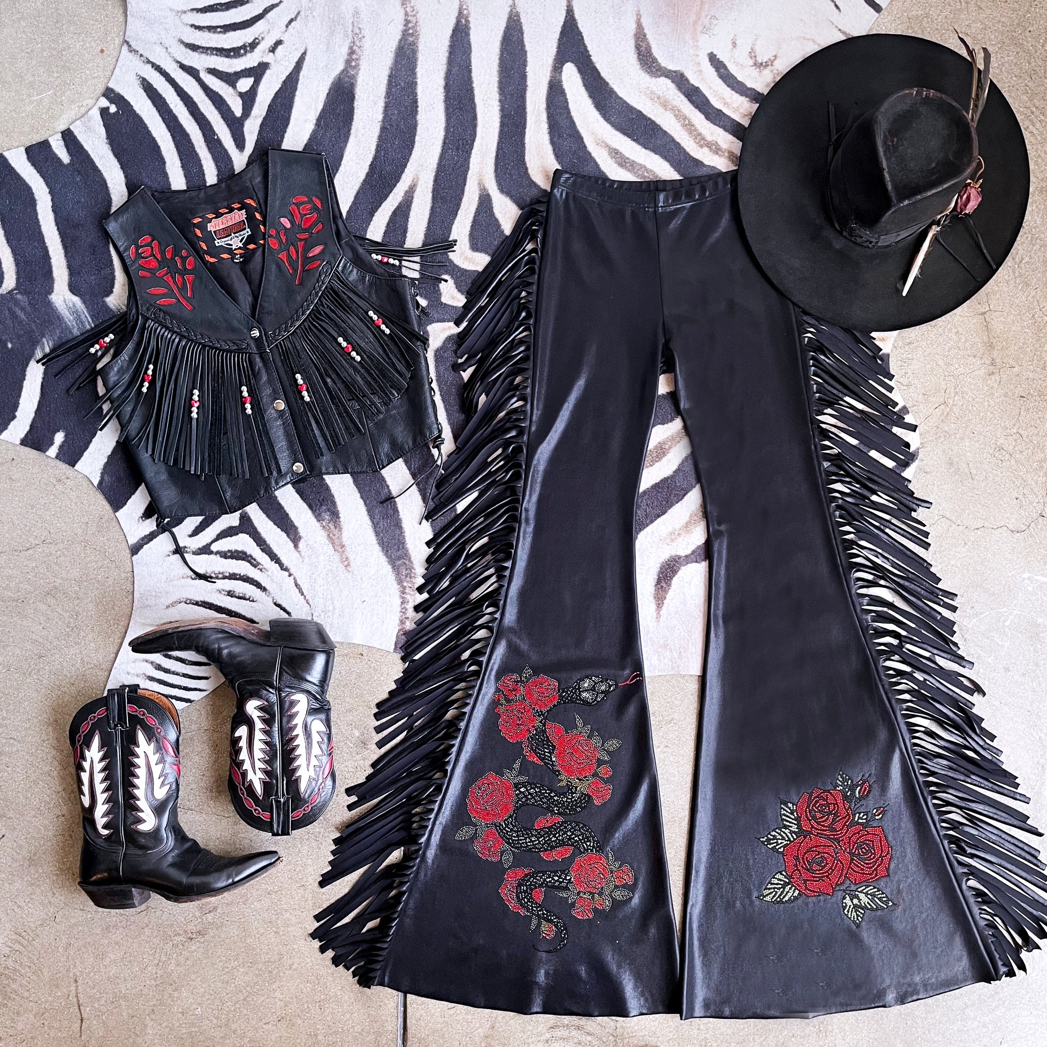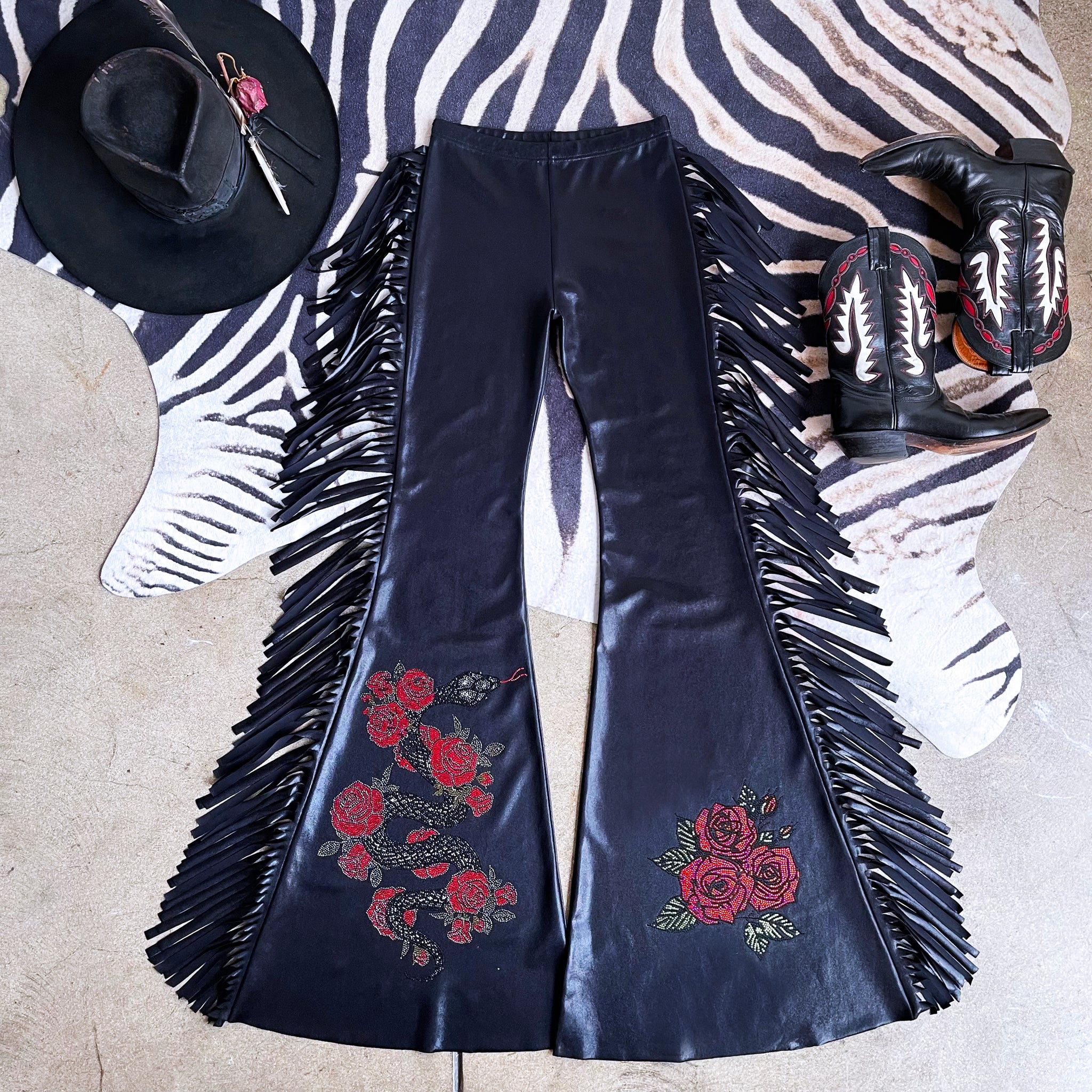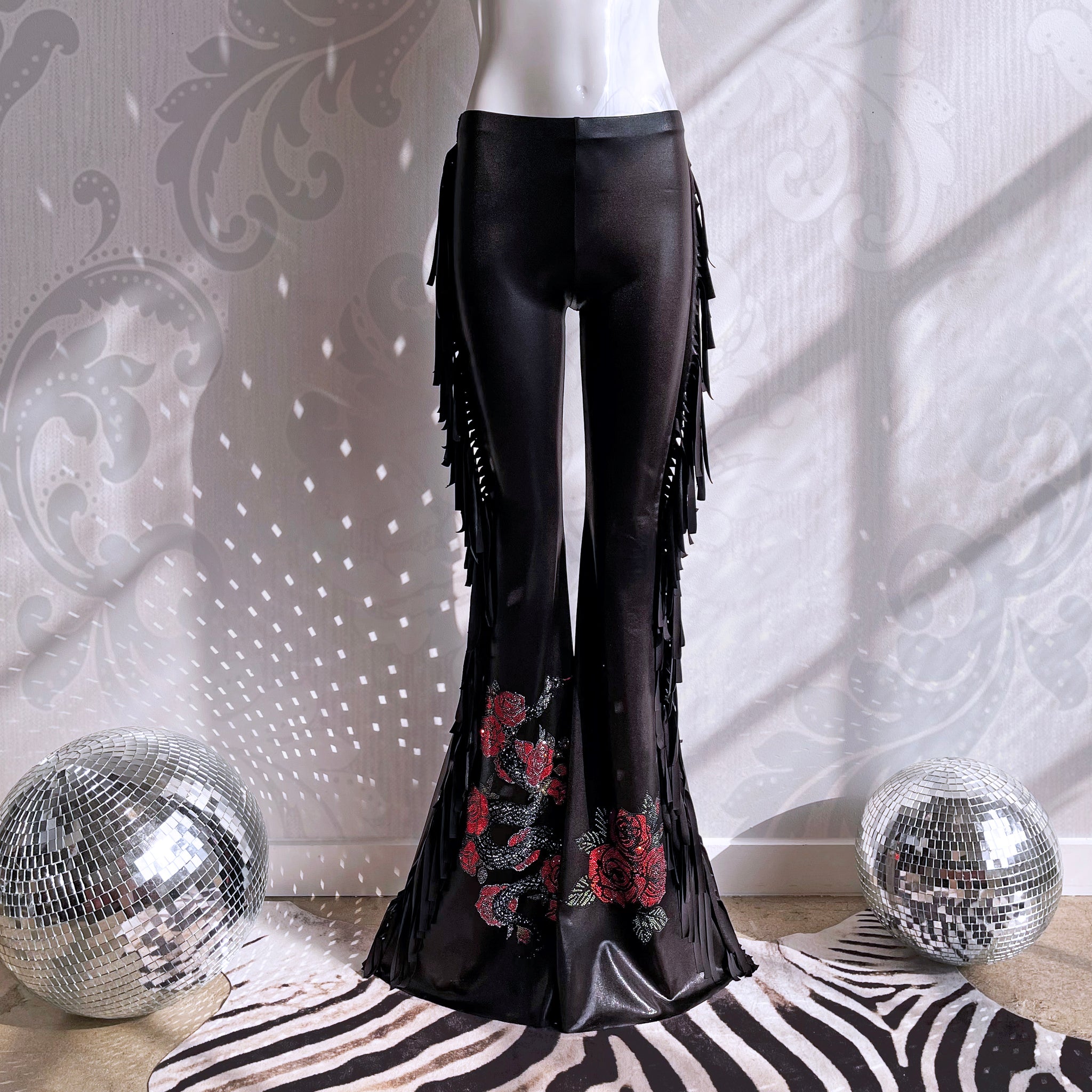 • Hand-placed crystal rose + serpent embellishment at one leg