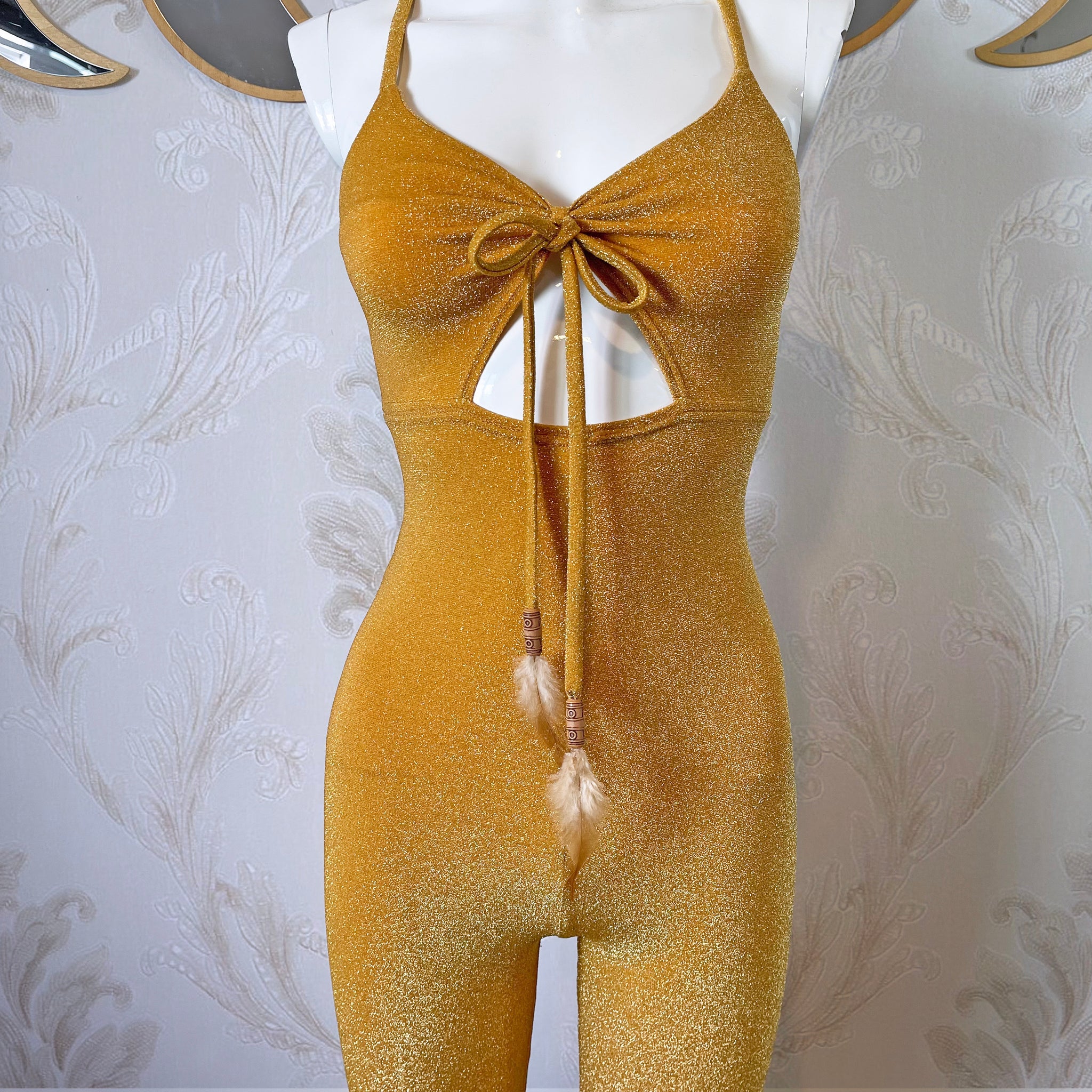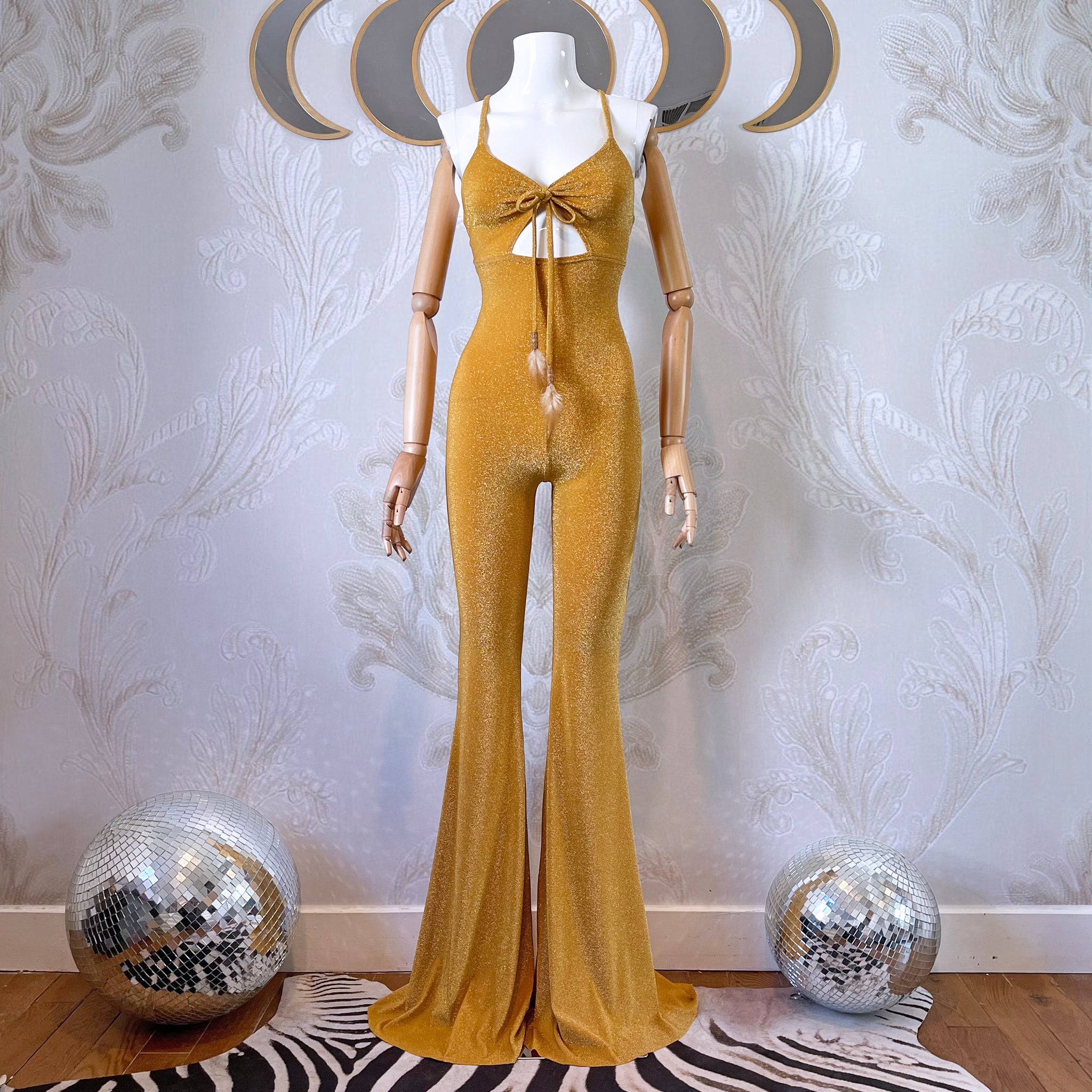 This show-stopping 70s-inspired jumpsuit features a flirty peek-a-boo front and a separate tie piece adorned with carved wooden beads and soft feathers — giving it that authentic boho-rock moment.