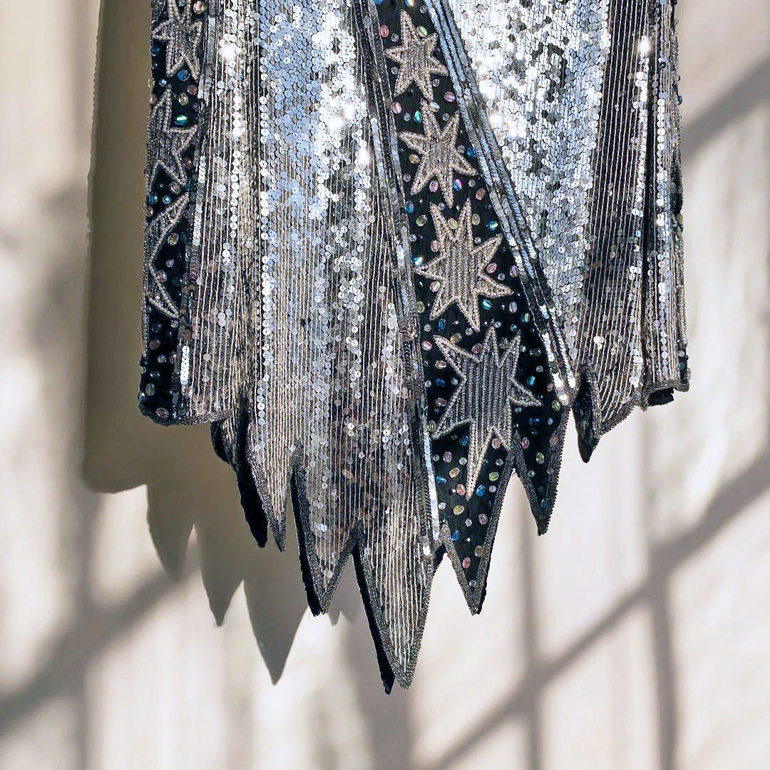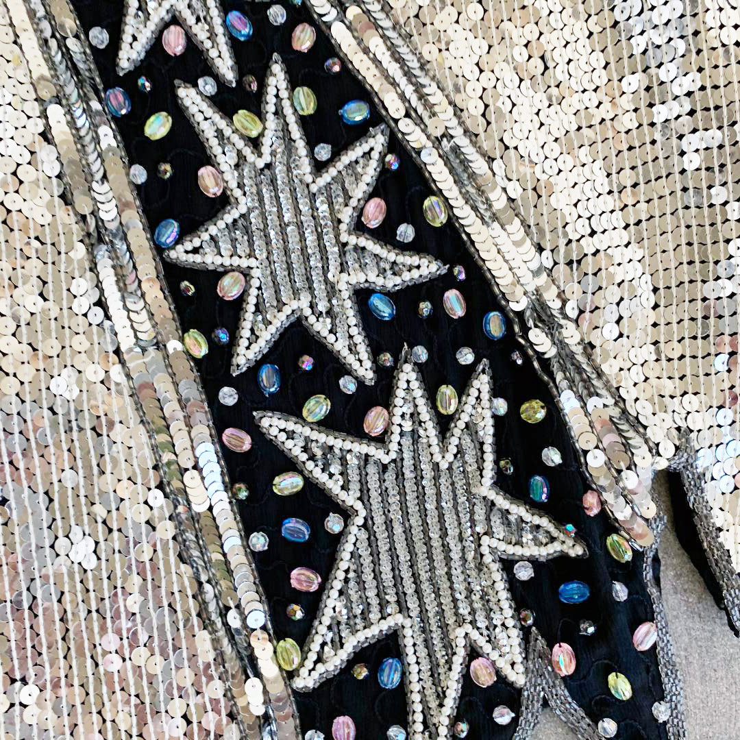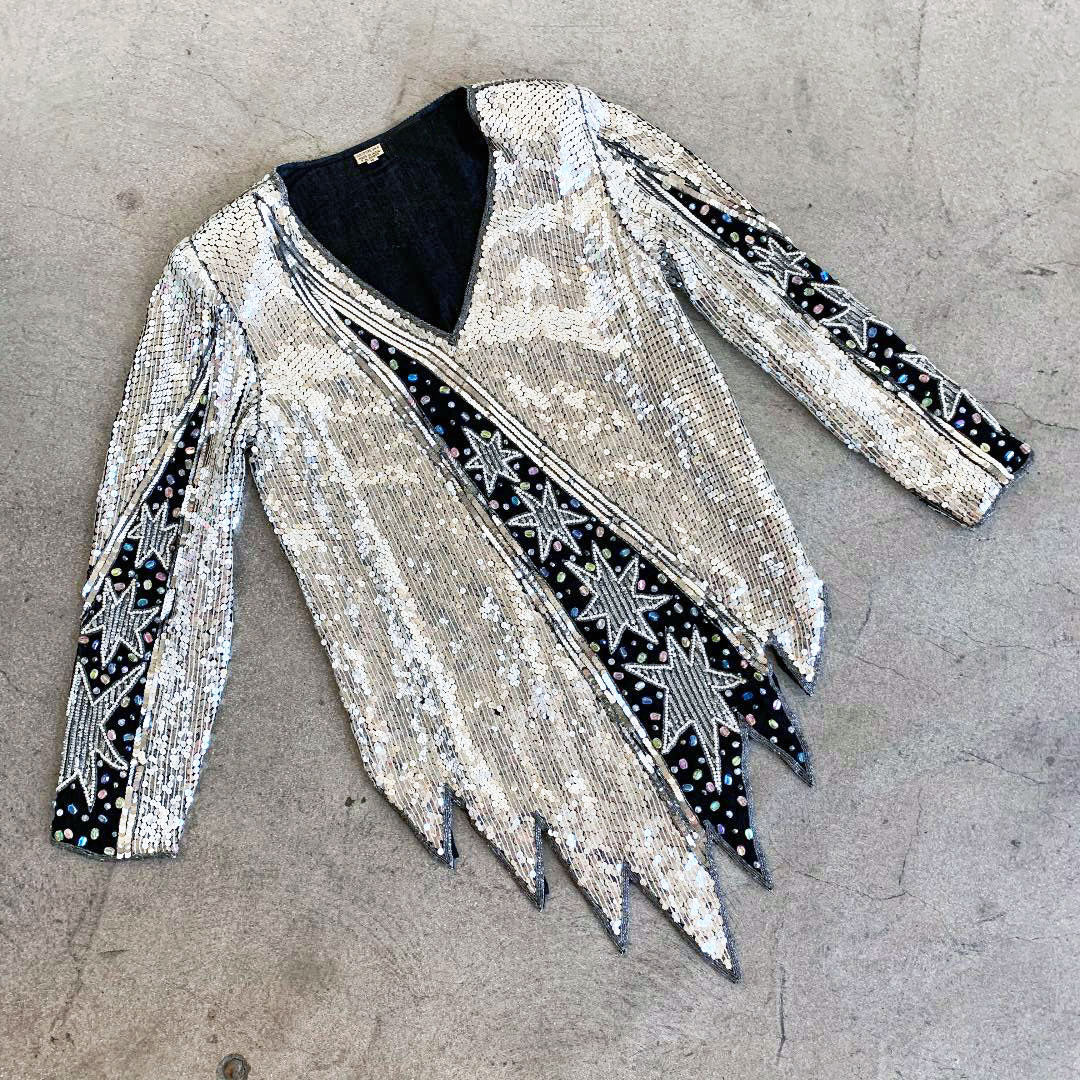 Killer sequin vintage tunic! Stunning silver sequins with an insane shooting star motif with chunky beads on front, back, and on sleeves. Scalloped edging finishes the ultimate glam rock look. Fully lined in silk. Shoulder pads giving you 80's strong shoulder. Excellent condition. Marked size S but will definitely fit a sz M...please see measurements.