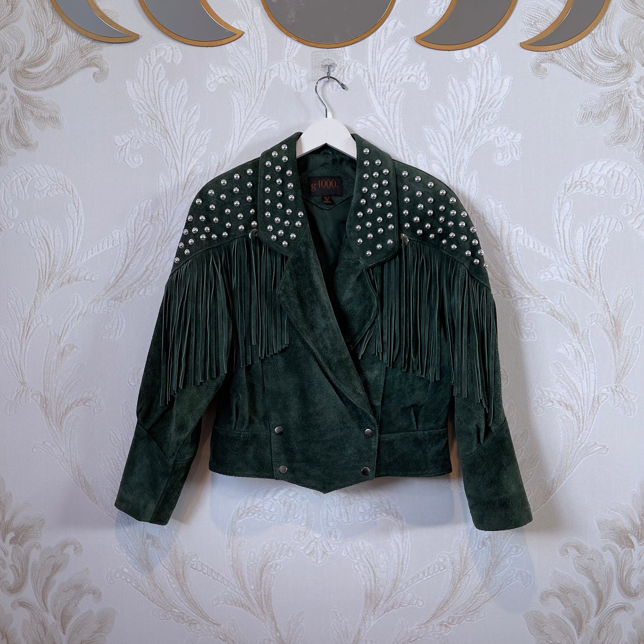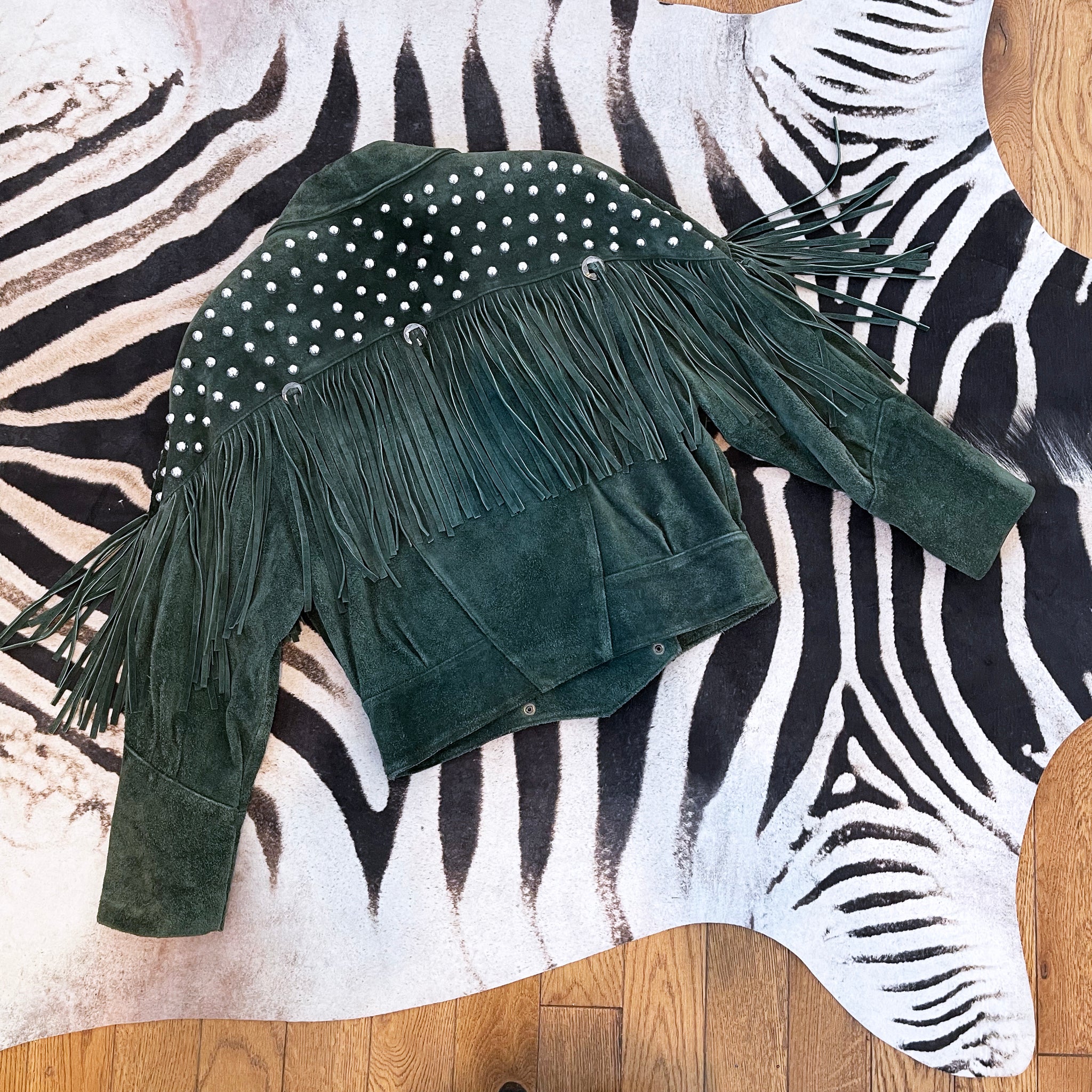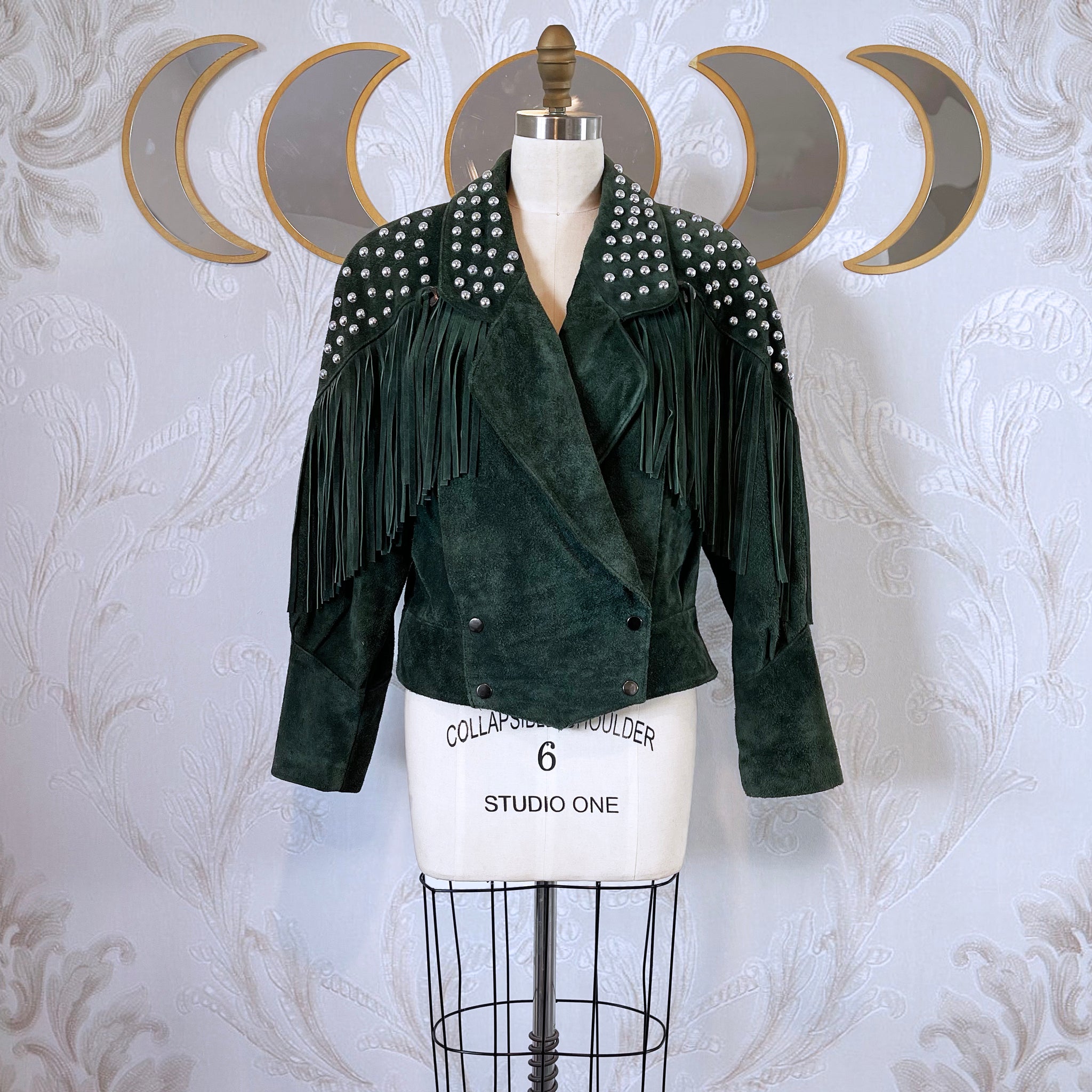 This one-of-a-kind vintage 1980s suede jacket has been thoughtfully upcycled and reimagined by hand. Cut from perfectly weathered RARE hunter green suede, it features dramatic fringe detailing and an all-over constellation of silver studs that have been individually hand-set and artistically affixed, giving the piece its name — It Is So Nice to Get Stoned.