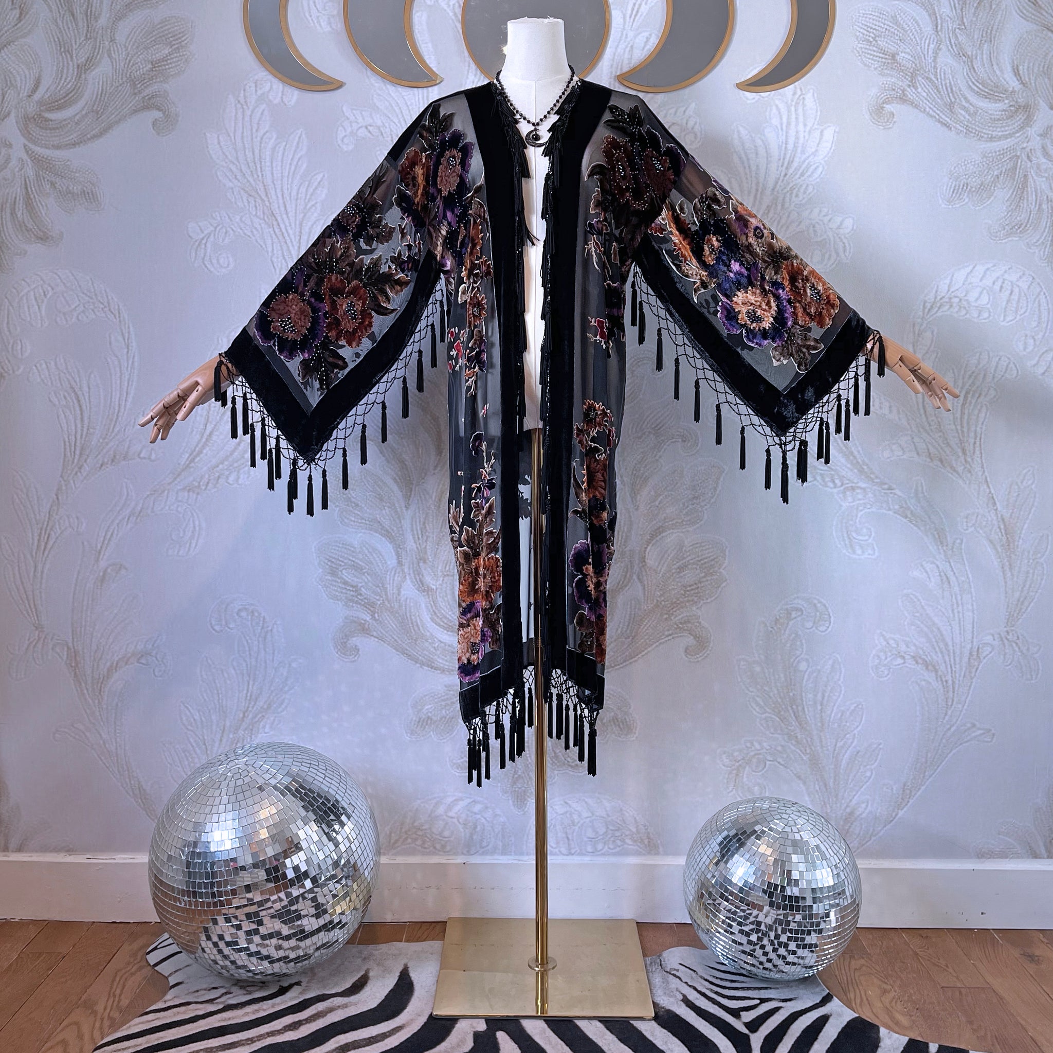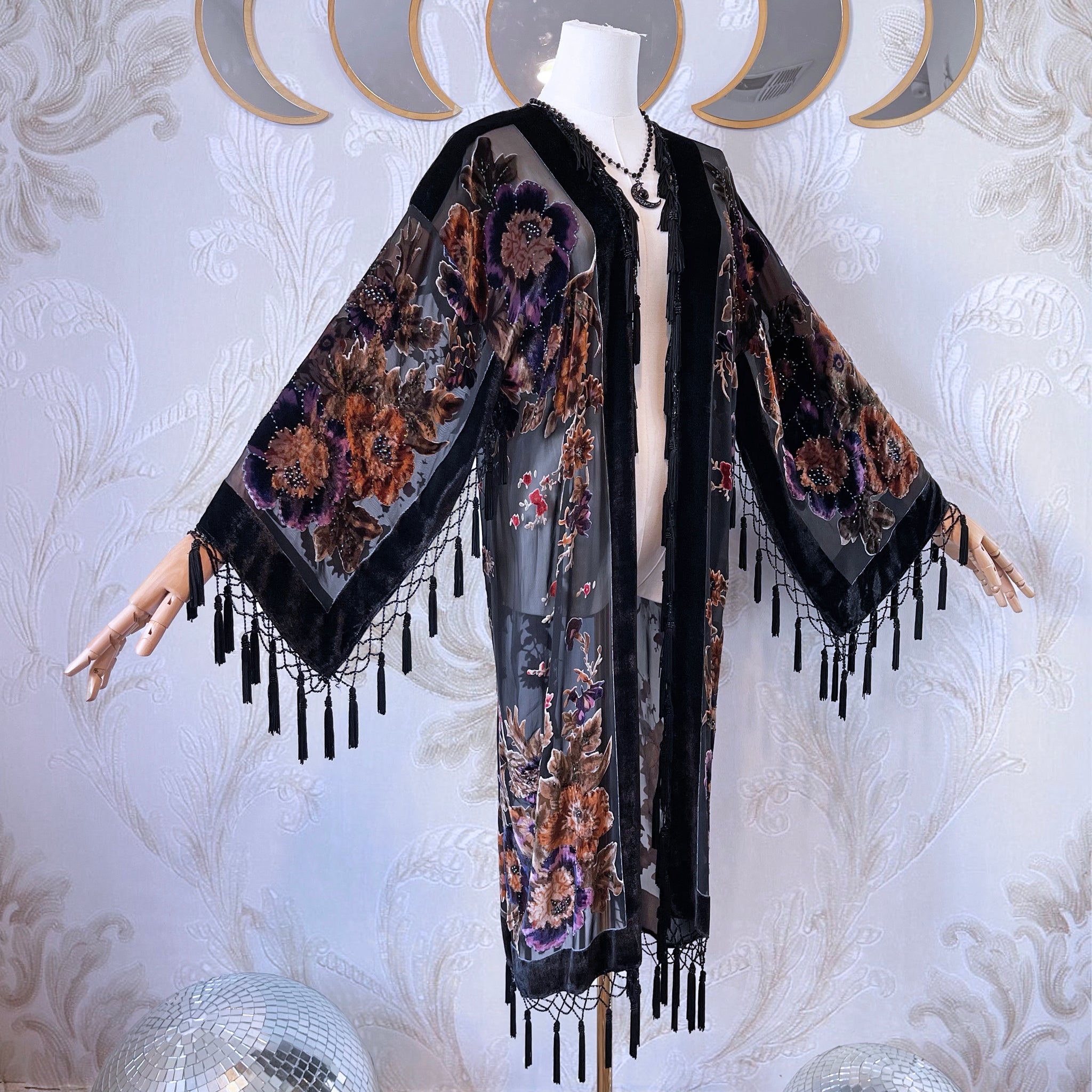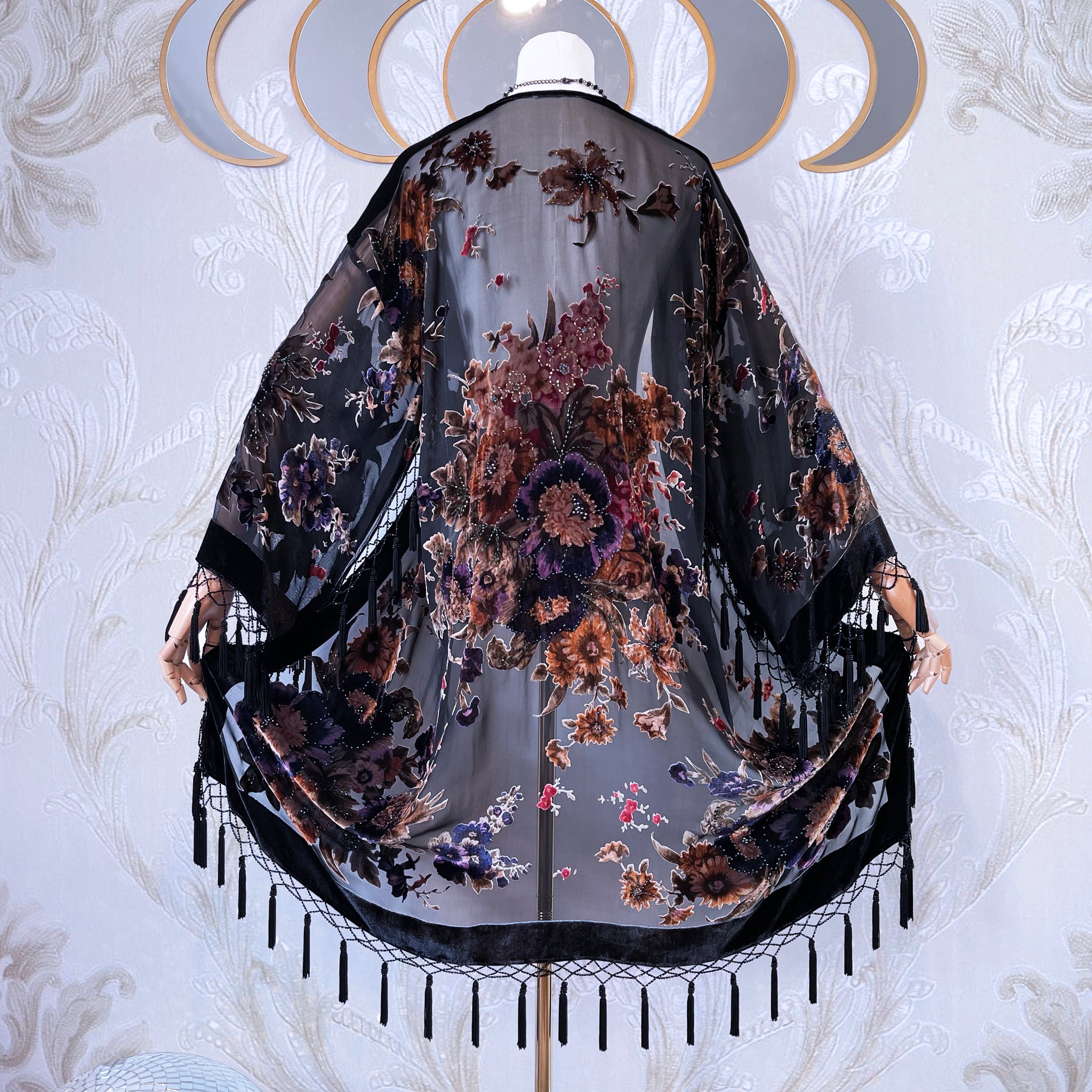 The Sweet Gypsy Rose kimono is crafted from exquisite silk/rayon velvet burnout, featuring a dark, richly layered floral design with a luminous, stained-glass–like effect. The contrast between sheer silk and plush velvet creates extraordinary depth, allowing the pattern to glow softly when backlit — a true work of wearable art.