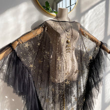 Absolute dreamy whimsical caftan...in a heavenly mesh with glittery stars and dots all over. All finished off with tons of ruffled tulle cascading along the sides for an extra ethereal feel.