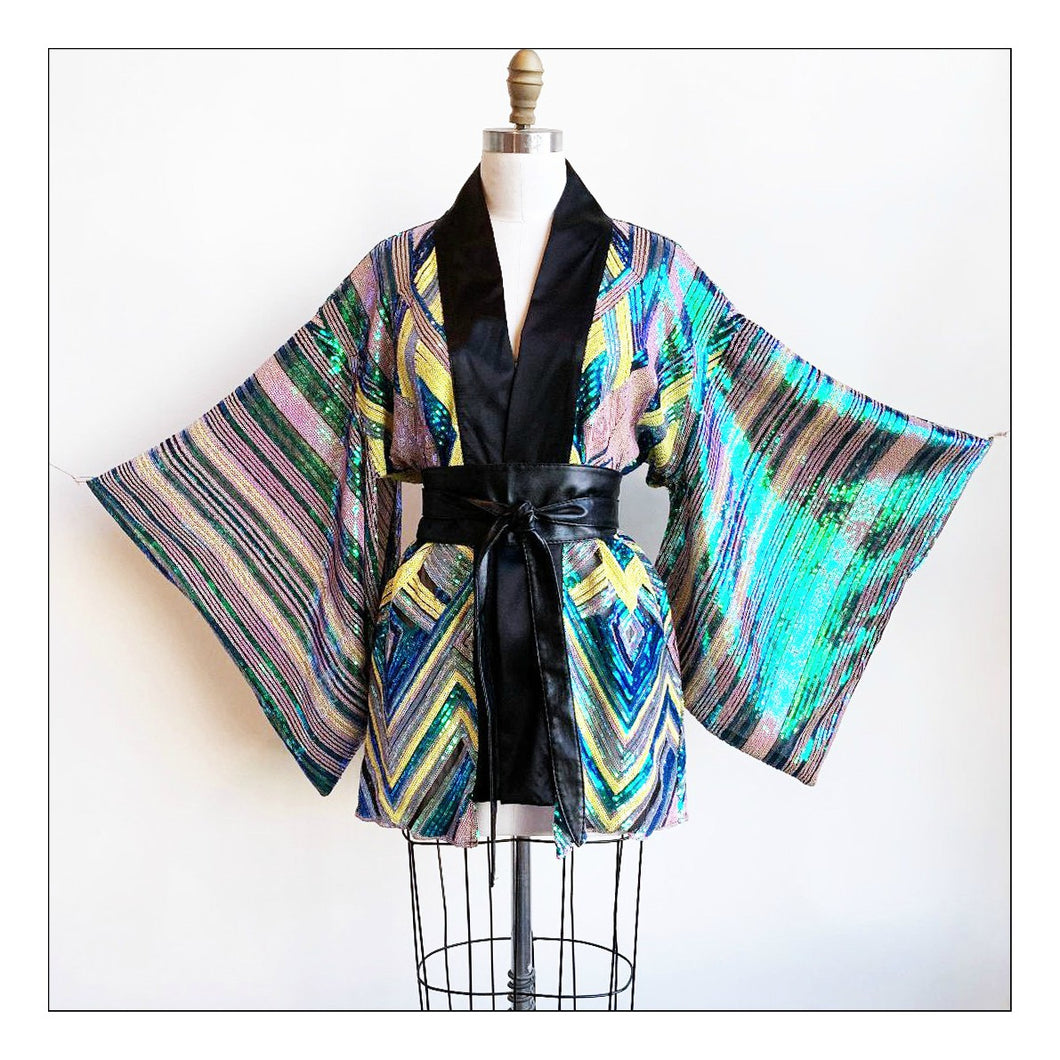 Decadent art deco sequin kimono. Insanely gorgeous in our stunning peacock colored paradise sequins. Cut with true kimono sleeve shape.